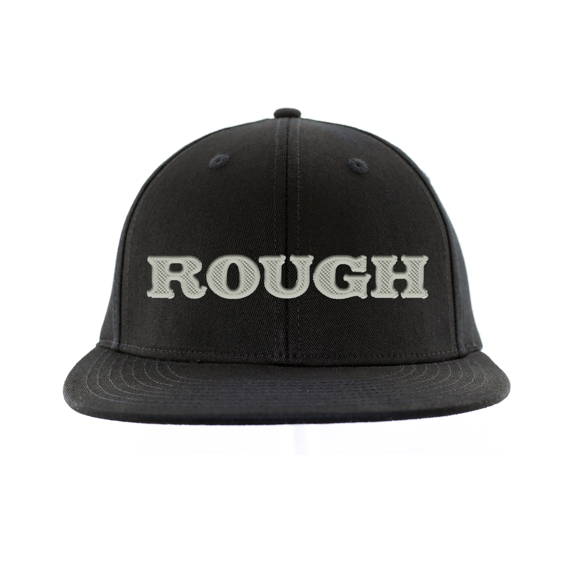 Embroidered ROUGH outline cap in black using io supply blanks.
